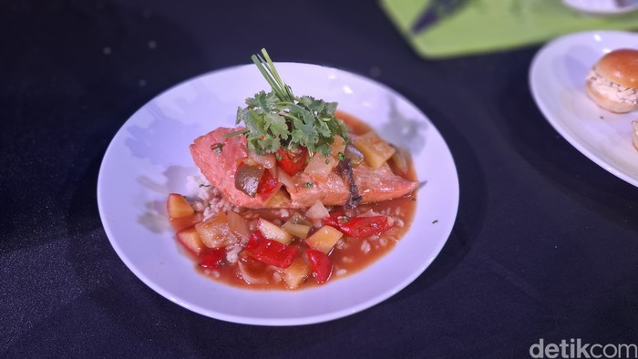Menu kedua yang lebih menantang adalah salmon liar (wild caught) dari Alaska yang diolah dengan saus asam manis pedas. Saus unik ini ternyata terinspirasi dari cita rasa masakan Padang, dengan sentuhan unik dari kurma Medjool.