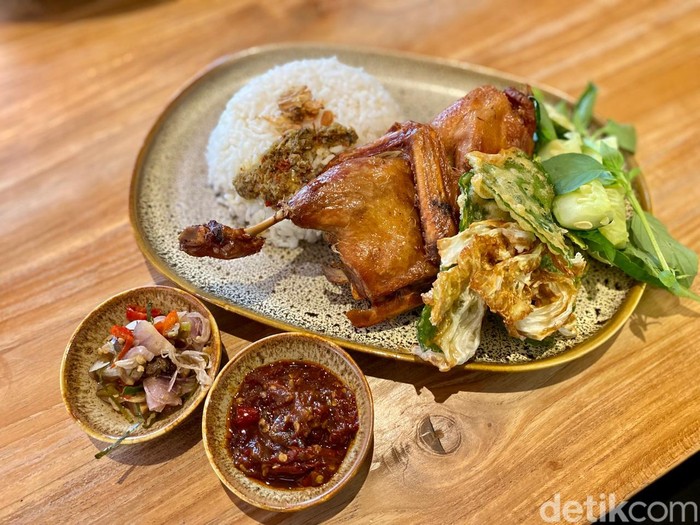 Nasi Bebek Asap Tegalalang (Rp 96.000) hadir dengan potongan bebek setengah ekor yang diasap dengan bumbu base gede asap. Tekstur dagingnya empuk dan beraroma smoky.